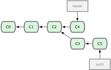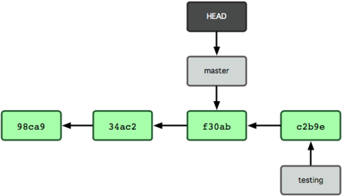 Notice that only testing branch (pointer) has move forward. But master branch still points to the commit you were on when you ran git checkout to switch branches.